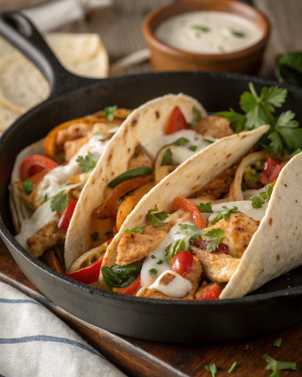 Turn the heat to low and dollop in your cream cheese and sour cream. Mix everything gently until the cream cheese melts into a velvety sauce, coating the chicken and veggies evenly. Splash in the lime juice and stir in fresh cilantro if you have it. This creamy, tangy sauce binds everything beautifully and keeps the fajitas irresistibly juicy and soft. Let it warm through for another 2-3 minutes, but don’t let it boil—nobody wants curdled cream.