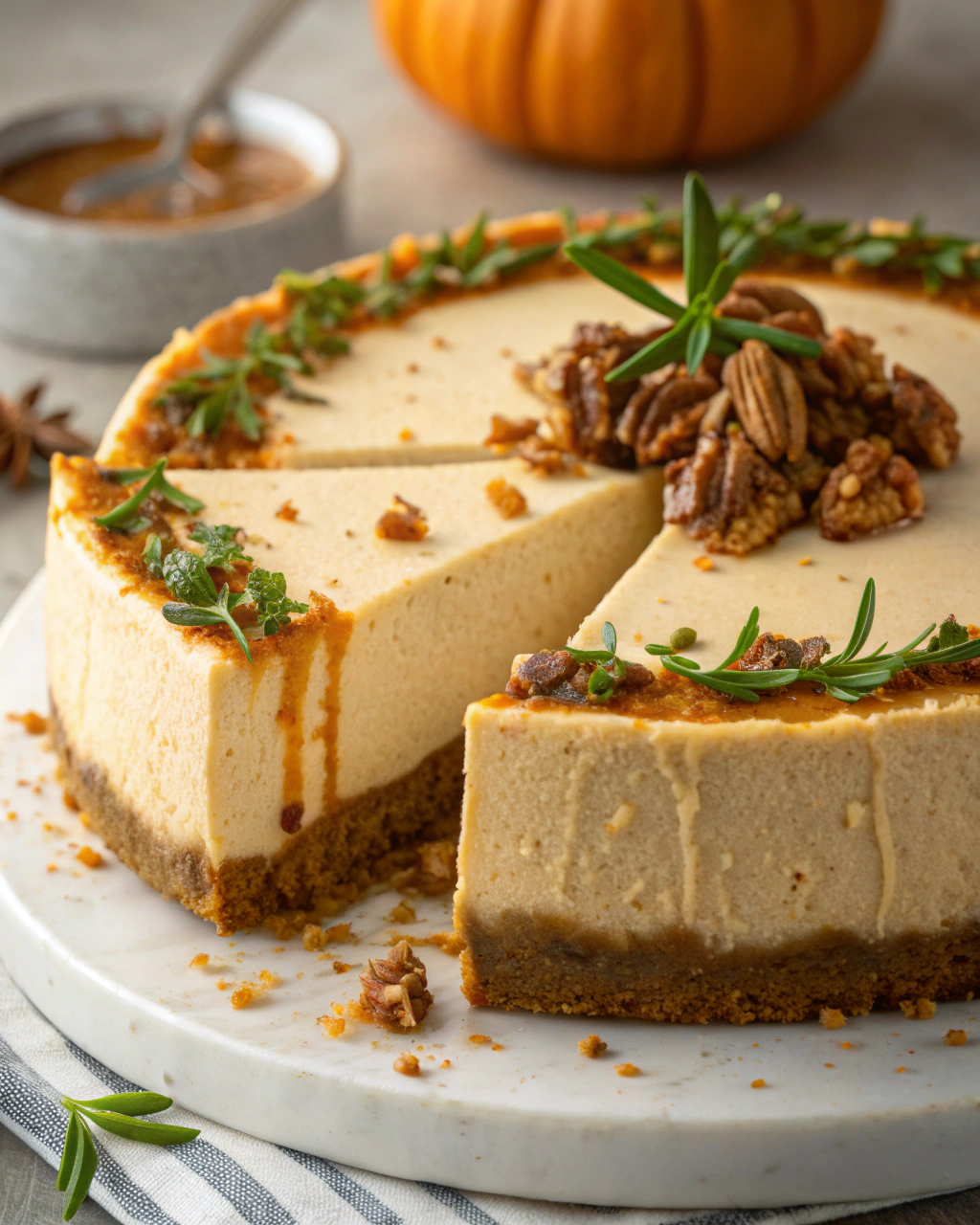 Creamy Pumpkin Cheesecake with Pecan Gingersnap Crust