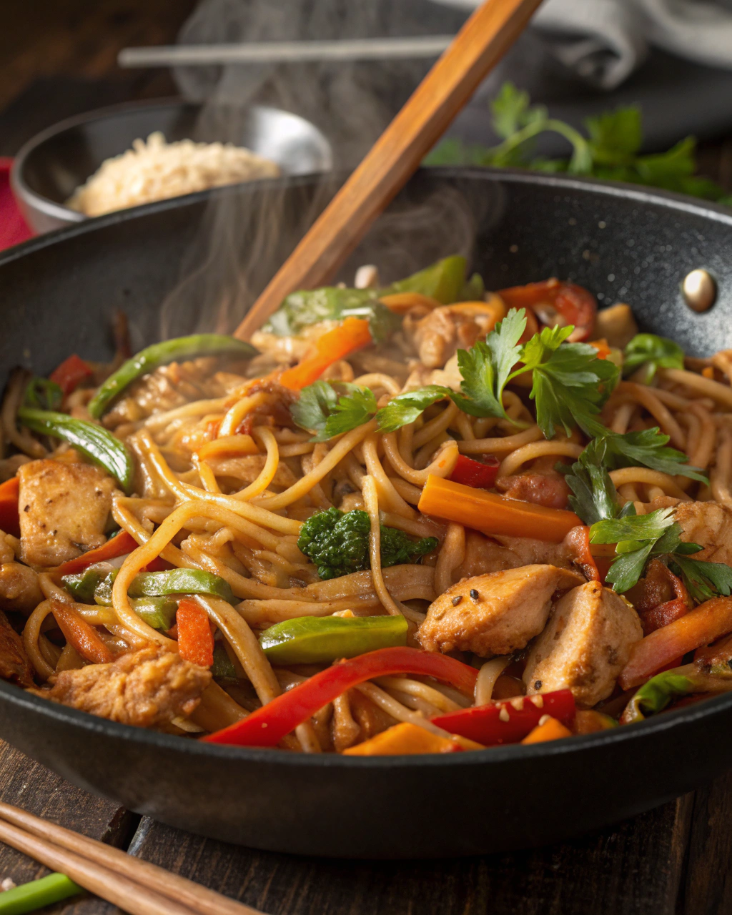 Return the chicken to the pan, then add the noodles. Toss everything together gently but thoroughly, making sure every noodle and veggie gets nicely coated with the sauce. Taste and adjust seasoning as needed.