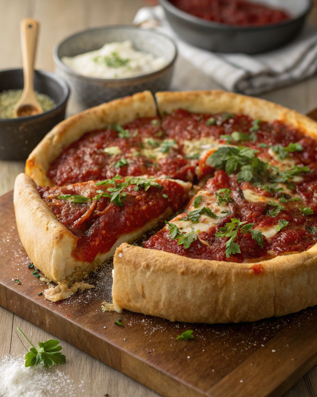 This deep dish pizza shines best fresh out of the oven beside a crisp green salad tossed with a tangy vinaigrette. It’s perfect for a chilly weekend night when you want something hearty and satisfying. Pair with a cold beer or a glass of red wine for the full Chicago dining vibe.