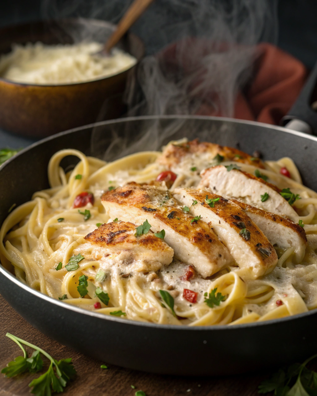 Stir in the Parmesan cheese and Italian seasoning. The sauce will instantly thicken and become silky. Taste it and adjust seasoning with salt and pepper. If it feels too thick, add a splash of pasta water to loosen it up—this little trick keeps the sauce perfectly creamy. Now toss the cooked pasta and chicken back into the skillet, gently folding everything together so each strand is lovingly coated in that dreamy sauce.