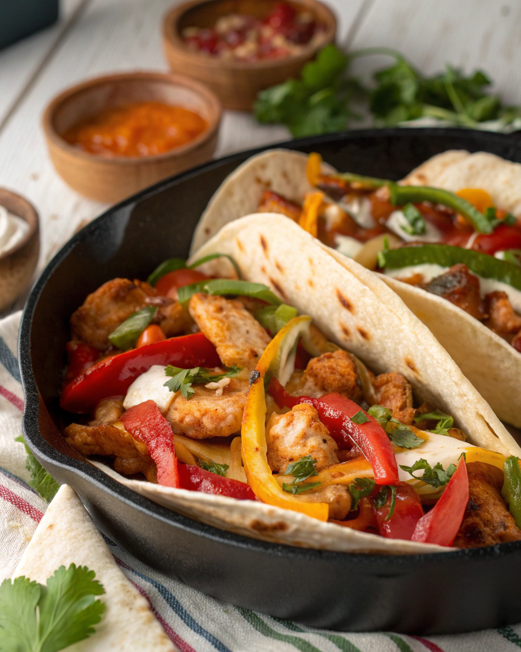 While your fajitas rest for a moment, whip up a simple sauce by mixing sour cream, lime juice, chili powder, and a pinch of salt. This adds an easy, cool contrast when drizzled on the warm fajitas. Serve everything straight to the table with warm tortillas and a sprinkle of fresh cilantro— and don’t forget the lime wedges for that extra zing!