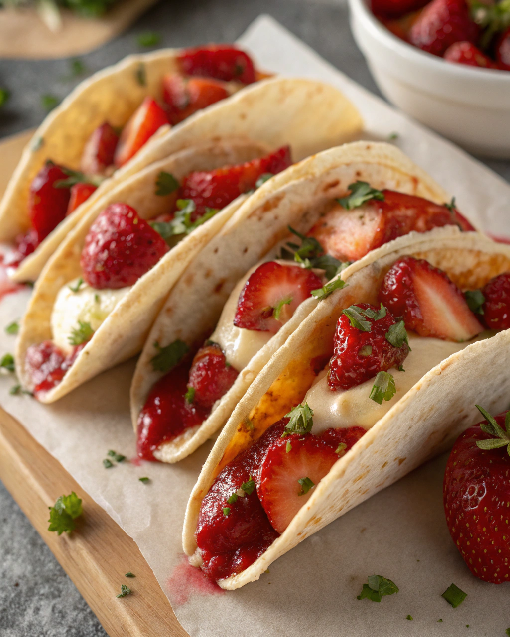 For a finishing touch, warm up some strawberry jam and drizzle it lightly over the tacos, sprinkle with a dusting of powdered sugar, and garnish with fresh mint leaves. These add vibrant color and a fresh aroma that makes them irresistible.