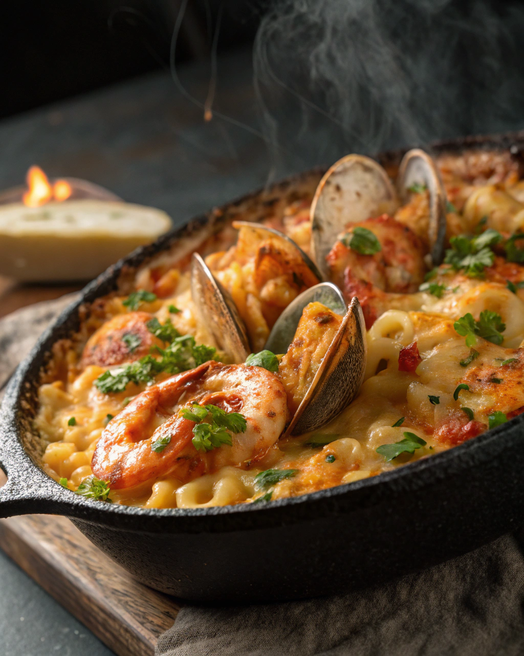 Remove from heat and stir in both cheeses until melted and smooth. Season with garlic powder, smoked paprika, salt, and pepper. Gently fold in the cooked seafood and the drained pasta, making sure everything is evenly coated.
