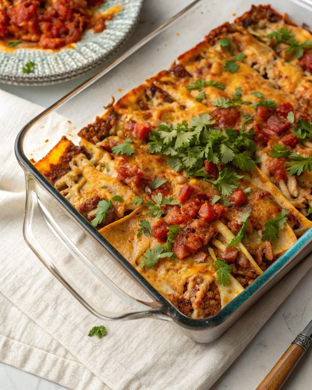 Preheat your oven to 375°F. Lightly grease a 9×13-inch baking dish. Spread half of the crushed tortilla chips evenly on the bottom.